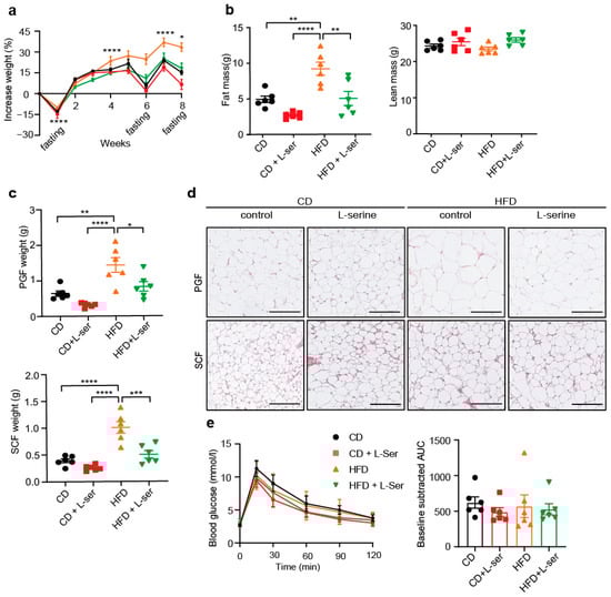 Pyruvate tolerance tests (PTTs), in contrast to insulin and glucose tolerance tests (GTTs), require an overnight fast to deplete hepatic glycogen stores. This results in a ~10–15% weight loss in mice, which is usually regained within a week. We observed a reduced weight regain in L-serine-supplemented HFD-fed mice following the PTT (Figure 2a). To test the role of L-serine supplementation in weight regain, we subjected CD and HFD mice with or without L-serine supplementation to additional overnight fasting. Indeed, L-serine supplementation in HFD-fed mice reduced body weight regain after each overnight fast (Figure 2a). The weight difference between the control and L-serine-supplemented mice increased with every fasting/refeeding cycle (Figure 2a). Liver weight did not change in any condition (Figure S2a), but triglyceride content decreased in the CD with L-serine supplementation (Figure S2b). In line with the triglyceride levels, liver histology showed fewer lipids in the CD-fed mice upon L-serine supplementation. Interestingly, L-serine seemed to decrease the size of the lipid droplets in the HFD, but not the number (Figure S2c). An assessment of body composition showed that the decrease in body weight was due to a reduction in fat but not lean mass (Figure 2b). This was also seen in a reduction in the weight of individual fat depots (Figure 2c) and the size of subcutaneous and perigonadal adipocytes (Figure 2d and Figure S2d). A gene expression analysis of TNFα IL-6 and CD68 expression in SCF and PGF revealed a significant downregulation of TNFα and a strong trend toward reduced CD68 expression in the PGF of HFD-fed L-serine-supplemented mice compared to HFD-fed controls (Figure S2e). We did not observe any differences in glucose tolerance between groups as the repeated fasting retained normal glucose tolerance in control HFD-fed mice when compared to the CD-fed mice (Figure 2e).