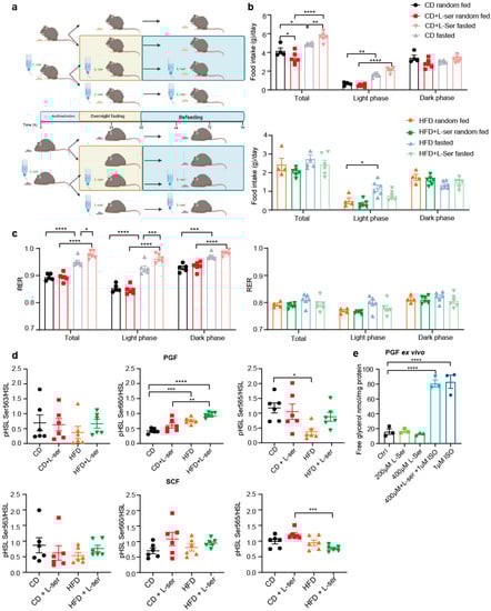 To study the metabolic changes induced by the interaction of fasting and L-serine supplementation, we studied CD-fed and HFD-fed mice either with or without serine supplementation in metabolic cages (Figure S3a). After acclimatization, the CD (after 7 weeks) and HFD (after 8 weeks) mice were fasted for 16 h in metabolic cages and food intake, energy expenditure, activity and respiratory exchange ratios were assessed in the 72 h thereafter (Figure 3a). As expected, daily food intake and cumulative food intake were increased in the CD-fed mice following an overnight fast compared to ad libitum-fed mice (Figure 3b and Figure S3b). A similar trend was observed in the HFD-fed mice. The increase in daily food intake was largely attributed to increased feeding during the light cycle. L-serine supplementation increased food intake in CD-fed, but not HFD-fed mice (Figure 3b and Figure S3b). A similar trend was observed for water intake (Figure S3c). In line with the changes in food intake, we observed increased Neuropeptide Y (Npy) and decreased Proopiomelanocortin (Pomc) expression in the hypothalamus of overnight-fasted mice fed a CD, whereas no statistically significant differences were observed in mice fed a HFD at the end of the 16-week L-serine supplementation (Figure S3d). No differences in Npy or Pomc expression between the control and L-serine-supplemented mice were observed in either experimental condition (Figure S3d). Thus, L-serine supplementation increased chow diet intake following an overnight fast compared to control animals. Conversely, there was a trend for slightly reduced food intake during the light phase in the HFD-fed L-serine-supplemented mice following an overnight fast. These data suggested that differences in food intake per se could not explain the reduced weight regain of HFD-fed mice upon serine supplementation. To this end, we investigated whether energy expenditure and substrate utilization, assessed by the respiratory exchange ratio (RER), were altered by serine supplementation. Ad libitum CD-fed mice showed the typical diurnal rhythm of substrate utilization with the highest RER during the dark phase (active phase) and the lowest values, indicating fatty acid oxidation, during the light phase (resting phase), with no differences between the control and L-serine-supplemented mice (Figure 3c). Fasting reduced the RER in all groups and diets (Figure S3e). This also demonstrated that consumption of L-serine through the drinking water did not significantly contribute to energy expenditure, as this would raise the RER. Refeeding rapidly increased the RER, which remained elevated throughout the remaining time measured (Figure S3e). The absence of diurnal fluctuations can be explained by the increased food intake during the light phase. The RER of control mice increased its amplitude during the 72 h following fasting, whereas the L-serine-supplemented mice remained at close to one throughout the whole time. This could result from the increased food intake observed in the L-serine-supplemented mice or indicate preferential oxidation of carbohydrates. The RER pattern was similar in the HFD-fed mice, albeit the overall amplitude of oscillation was reduced due to the increased dietary fats (Figure 3c). Moreover, fasted mice returned more rapidly after the next dark cycle to the diurnal oscillation observed in ad libitum-fed mice (Figure S3e). Interestingly, L-serine supplementation lowered the RER in the HFD-fed mice compared to controls, potentially indicating increased adipose tissue lipolysis (Figure S3e). To this end, we quantified HSL phosphorylation at the activating sites Ser563 and Ser660, as well as the inhibitory Ser565 site in SCF and PGF following an overnight fast (Figure 3d and Figure S3f). We observed increased Ser660 and reduced Ser565 phosphorylation in HSL in the HFD compared to the CD-fed animals in PGF. However, we did not observe any differences between the control and L-serine-supplemented mice irrespective of the diet. In addition, serine supplementation led to a reduction in phosphorylation of Ser565 in the CD compared to the HFD in SCF (Figure 3d). Thus, these data did not suggest an increased lipolysis in white adipose tissue in the interaction of fasting and L-serine supplementation. Moreover, ex vivo stimulation of PGF with either 200 µM or 400 µM L-serine did not increase lipolysis as measured by glycerol release into the medium (Figure 3e). We also did not observe an effect of 400 µM L-serine on isoproterenol-induced lipolysis (Figure 3e).