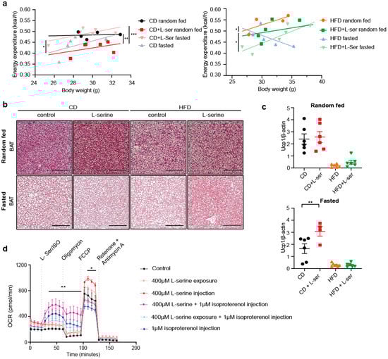 L-serine supplementation alters energy expenditure and potentiates mitochondrial respiration. (a) Energy expenditure after overnight fasting in relation to body weight of random fed and fasted CD (chow diet) and HFD (high-fat diet)-fed mice with or without L-serine supplementation at weeks 7 (CD) or 8 (HFD) (CD random fed: n = 5; CD fasted, CD+L-ser random fed, CD+L-ser fasted: n = 6; HFD random fed: n = 4; HFD fasted, HFD+L-ser random fed, HFD+L-ser fasted: (n = 6). (b) Representative H&E stainings of brown adipose tissue (BAT) from random fed and fasted CD-fed and HFD-fed mice with or without L-serine supplementation after 8 weeks starting at 4 (random fed) and 8 (fasted) weeks of age. Scale bars show 100 µM. (c) Quantification of uncoupled protein 1 (UCP1) protein content normalized to beta actin from BAT of random fed and fasted CD-fed and HFD-fed mice with or without L-serine supplementation (n = 6). (d) Oxygen consumption rate (OCR) of differentiated primary brown adipocytes pre-treated or not with 400 µM L-serine and acutely exposed (injected) to 400 µM L-serine and/or 1 µM isoproterenol (n = 3 replicates from 2 mice). Statistical analysis in panel a is described in Section 2.10. Data are shown as mean ± SEM, one or two-way ANOVA with Tukey’s post-hoc test. * p < 0.05, ** p < 0.01,*** p < 0.001.
