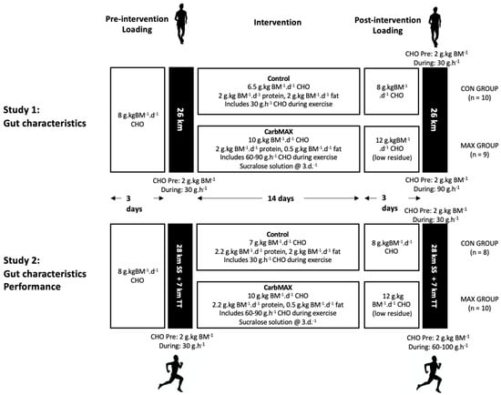 This study consisted of two very similar and sequential investigations in two different cohorts of highly trained athletes, embedded in highly supervised training camps. This allowed experiences from the first study (data and feedback from the study cohort) to inform small refinements in gut-training elements of the overall intervention for implementation in the second investigation. Both investigations utilised a 14-day dietary intervention, with athletes allocated to either a moderate CHO intake (control: CON) or a novel, multi-pronged experimental approach to increasing CHO availability and utilisation during exercise (MAX). In Study 1, 19 elite male race walkers, ranging from Tier 4/5 (international level competitor, n = 15) to Tier 3 (national level training partner, n = 4; [29]), were recruited to participate in one of two training camps held in January and May 2018 [9]. In Study 2, 16 Tier 3 runners (11 males, 5 females) were recruited to participate in one of three 3-week training camps held in February, March, and November 2019. Criteria for involvement in the study included completion of the marathon distance (42.2 km) in under 2 h 30 min (males) or 2 h 45 min (females). Two runners participated in two camps and completed both dietary arms of the study, giving a final sample size of 18. All athletes were free of current injury and undertaking consistent training at the time of the camp. Subject characteristics for both athlete cohorts can be found in Table 1, while a summary of the studies is provided in Figure 1.