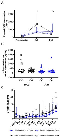 Mean (A) and individual changes (B) in plasma I-FAPB concentration pre- and post- a 26-km race walking session, and (C)mean breath H2 values pre-, during, and post-session in elite race walkers before (pre-intervention) and after (post-intervention) a protocol to increase endogenous and exogenous CHO availability (MAX), compared with a control condition (CON) involving moderate CHO availability. Data are mean and standard deviations; * = significant increase from pre-exercise. # = significant decrease from Ex0. Ex0: immediately post-exercise; Ex followed by numeral represents time (in hours) post exercise ending: e.g., Ex1: 1 h post-exercise; Δ (delta): change in reported variable.