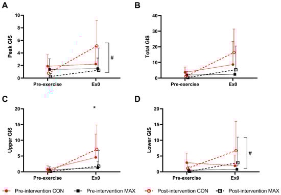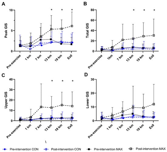 (A) Peak, (B) total- (C) upper-, and (D) lower-GIS during a 26 km race walking protocol in elite race walkers before (pre-intervention) and after (post-intervention) a protocol to increase endogenous and exogenous CHO availability (MAX) compared with a control condition (CON) involving moderate CHO availability. Data are presented as mean and standard deviation of summative accumulation of respective GIS category. * = significant difference between the CON and MAX groups.