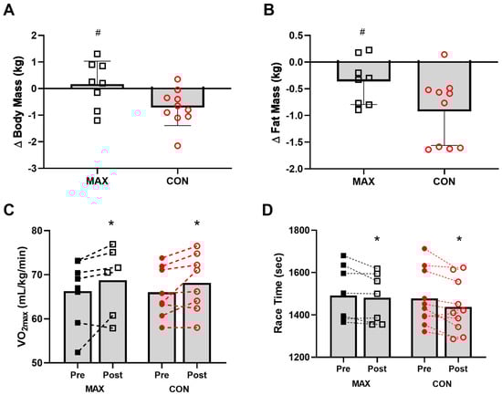 Changes in body mass (kg) (A), and fat mass (kg) (B) on morning of 35 km race in highly trained marathon runners before (Pre) and after (Post) a protocol to increase endogenous and exogenous CHO availability (MAX) compared with a control condition (CON) involving moderate CHO availability. Relative maximal oxygen uptake (mL·kg−1·min−1) Pre and Post intervention (C) and running performance time (s) for the 7 km time trial (D) shown for both groups. Data are presented as mean ± SD. * = significant difference Pre- and Post-intervention; # = significant difference between CON and MAX. Closed squares and circles represent individual data for Pre, open squares and circles represent individual data for Post. Δ = change in reported variable.