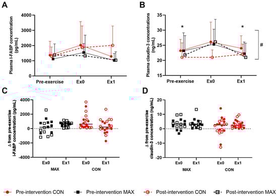 Mean (A,B) and individual changes (C,D) in plasma I-FAPB (A,C) and claudin-3 (B,D) concentration pre- and/or post-a 35-km race in highly-trained distance runners before (Pre-intervention) and after (Post-intervention) a protocol to increase endogenous and exogenous CHO availability (MAX), compared with a control condition (CON) involving moderate CHO availability. Data are mean and standard deviations; * = significant difference compared to Ex0. # = significant difference between pre- and post-intervention. Δ = change in reported variable.