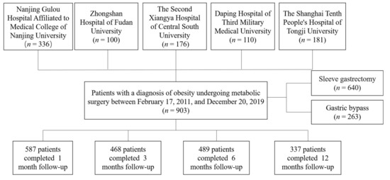 Nine hundred and three obese patients were recruited from five different hospitals in China (Figure 1). All subjects accepting SG or RYGB met the criteria for MS [20]. T2D and NGT (normal glucose tolerance) was diagnosed according to the World Health Organization criteria [23]. After surgery, patients were advised to take supplemental multivitamins, including iron 45–60 mg (daily), vitamin B12 350–500 mg (daily), folate 400–1000 mg (daily), and vitamin D3 3000 IU (daily), calcium 1200–1500 mg (daily) and protein 60–120 g (daily) [24]. Moreover, patients were asked to complete the follow-up evaluation at 1, 3, 6, and 12 months for the first postsurgical year.