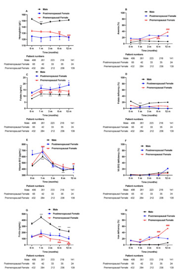 The folate levels were increased postoperatively (Figure 2C), although no significant difference in the folate deficiency rate was observed in all patients after 1-year visits. (Figure 2D). Interestingly, vitamin B12 levels increased at 1 month (p < 0.001) after surgery and then decreased at the following visits (Figure 2E). Nevertheless, the prevalence of vitamin B12 deficiency remained unchanged at 12 months after surgery (Figure 2F). Among all patients, the ferritin levels increased significantly at 1 month after surgery and then decreased at the following visits (Figure 2G). The iron deficiency (defined as ferritin levels <30 ng/mL) was increased in the premenopausal female groups across our study (14.1% vs. 53.5%, p = 0.000) (Figure 2H).
