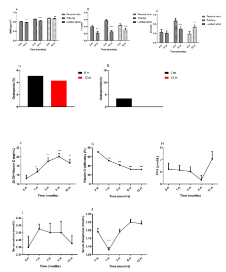 Changes in bone metabolism and BMD in patients following MS. (A): BMD; (B): T-score; (C): Z-score; (D): Osteopenia (%); (E): Osteoporosis (%); (F): 25-OH-Vitamin D; (G): Vitamin D deficiency (%); (H): PTH; (I): Serum calcium; (J): Serum phosphorus; Abbreviations: BMD, bone mineral density; MS, metabolic surgery; PTH, parathyroid hormone. Data are presented as the mean ± SEM. * p < 0.05, ** p < 0.01, *** p < 0.001 compared with baseline.
