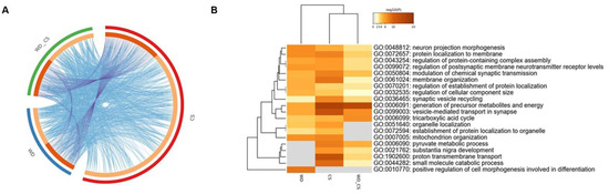 Enriched terms identified for proteins that were significantly different in the WD and CS/WD groups (both in comparison to CTR), filtered and hierarchically clustered (Metascape). (A) The circos plot shows how genes from the input gene lists overlap. On the outside, each arc represents the identity of each gene list (blue: WD; red: CS; green: WD/CS). On the inside, each arc represents a gene list, where each gene has a spot on the arc. Dark orange color represents the genes that appear in multiple lists, and light orange color represents genes that are unique to that gene list. Purple lines link the same genes that are shared by multiple gene lists. Blue lines link the different genes where they fall into the same ontology term (Metascape). (B) Enriched terms (Biological processes, GO: BP) identified for proteins that were significantly different in the WD, CS, and WD/CS groups (all in comparison to CTR), filtered, and hierarchically clustered (Metascape).