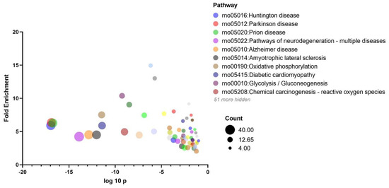 The gene names of significantly regulated proteins (q < 0.05 and fold-change of +/−50%) were submitted to a PANTHER Overrepresentation Test online (http://www.pantherdb.org, accessed on 2 February 2022) using PANTHER version 16.0 (released 16 November 2021). The PANTHER functional annotation tool [28,29] and Metascape [30] were used to identify the significant ontology associations. The complete list of Rattus norvegicus proteins detected by mass spectrometry-based proteomics was used for the background, while the GO term subcategories “GOTERM_BP_DIRECT”, “GOTERM_CC_DIRECT”, and “GOTERM_MF_DIRECT” were selected for analysis. The false discovery rate (FDR) correction of Fisher’s p-value was applied to identify the significant functional annotations (significance was considered when p < 0.05).
