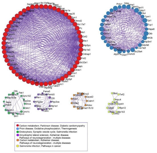 To reveal the pathways involved in proteins that were differentially expressed between the four experimental groups, KEGG pathway analysis was employed. As shown in Figure 4, the three most significantly enriched pathways were Huntington’s, Parkinson’s, and Prion diseases. Calmodulin 2 (Calm2), tubulins (Tubb4a, Tuba1a), Alpha-synuclein (Snca), and proteins involved in response to oxidative stress and mitochondrial metabolism (cytochrome c oxidase, ATP synthase, and NADH dehydrogenase subunits) were enriched in those pathways. The pathways of neurodegeneration/multiple diseases and diabetic cardiomyopathy were also significant pathways and shared altered proteins such as Atp2a32, Uqcr10, Ndufa12, Vdac1, and Vdac3. In order to further comprehend the interactions among the altered proteins, pathway and process enrichment analyses have been carried out with the following KEGG Pathway.