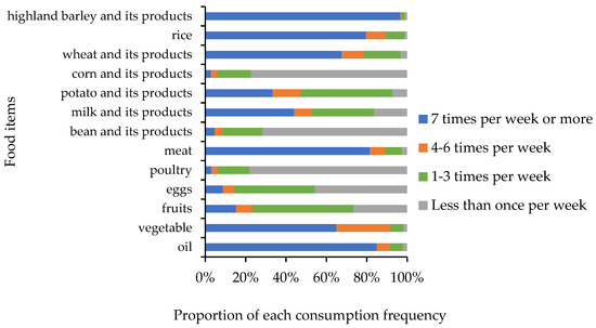 The questionnaire comprised 23 questions in three sections, including information on (1) individual factors (such as gender, age, and education attainment); (2) family characteristics (such as number of family members and their age and family annual income); (3) the consumption frequency of 13 kinds of foods in the previous month. According to local dietary habits, the types of food investigated in this study were rice, meat, poultry, eggs, fruits, vegetables, and oil, including the following foods and their products: highland barley, wheat, corn, potato, milk, and beans. Salt is an essential part of the Chinese diet, and fish consumption by Tibetan residents was very low according to our field investigation; therefore, these were not included in this study. Considering that the food consumption structure of Tibetan residents is relatively singular, and some foods are consumed monthly, the consumption frequency was investigated using a calendar month as the unit before being converted into a weekly frequency.