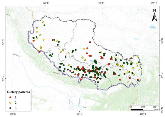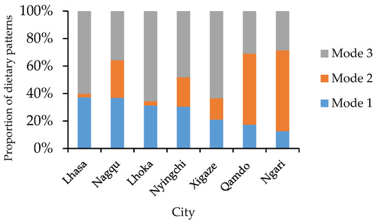 The proportions of the three modes were 26.74%, 23.34%, and 49.92%, respectively, implying that approximately half of the subjects had comparatively unbalanced dietary patterns. In terms of geographical distribution, the dietary patterns in eastern and central Tibet were more ideal than that in the western regions (Figure 3 and Figure 4). There were observed differences in the composition of the three modes among cities (Figure 4).