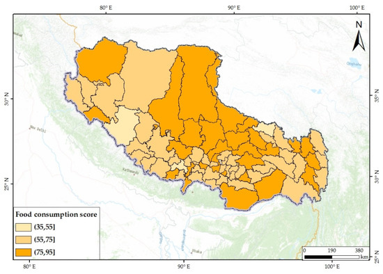 The results showed that most of the subjects achieved food security (FCS > 35) [30]. The distribution of the mean value of FCSs showed aggregation in different ranges, and counties with low FCSs were scattered (Figure 5). This suggested that the reasons for low FCSs might be divergent. There were significant differences in FCSs among cities and counties (Figure 6) that might be due to the differences in socioeconomic, natural, and transportation conditions in different regions.