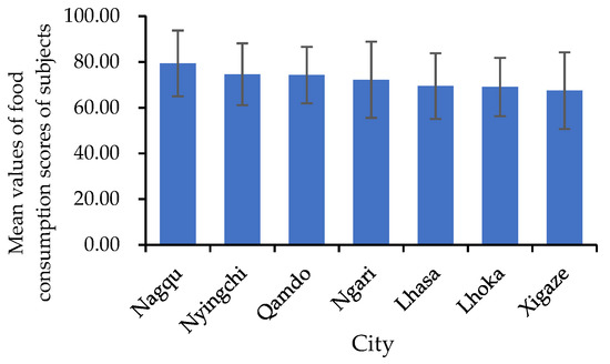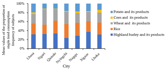 Mean values of the proportion of staple food consumption frequency of subjects in cities in Tibet.