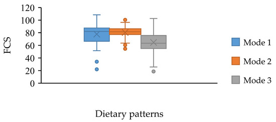 After non-parametric testing, the FCSs of the three modes were significantly different (p value < 0.01). After pairwise comparison, the FCSs of mode 3 were significantly lower than that of modes 1 and 2 (Figure 9). This demonstrated that subjects who were more dependent on staple food tended to have lower FCSs.