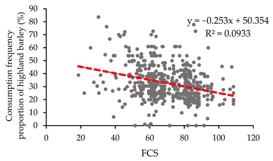 Relationship of the proportion of highland barley consumption frequency (%) and food consumption scores (FCS).