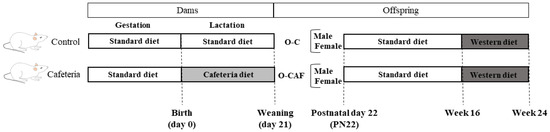 Experimental design scheme of the animal model used in this study. Abbreviations: PN22, postnatal day 22, O-C, offspring of control dams; O-CAF, offspring of cafeteria diet-fed dams.