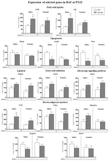 Expression of selected genes related with lipid metabolism (lipogenesis, lipolysis, fatty acid uptake, and fatty acid oxidation) and thermogenesis (adrenergic signalling and brown adipocyte markers) in brown adipose tissue (BAT) of male and female offspring of dams fed a control (O-C) or a cafeteria diet during lactation (O-CAF) ad libitum conditions at postnatal day 22 (PN22). mRNA levels were measured by real-time PCR and expressed as a percentage of the value of O-C males. The full names of the genes are indicated in the material and methods section. Data are expressed as the mean ± standard error of the mean of 6–8 animals per group. Statistics: D, effect of maternal diet (control/cafeteria) during lactation; S × D, interaction between sex and maternal diet (p < 0.05, two-way ANOVA). *, O-CAF versus O-C (p < 0.05, Mann–Witney U test).