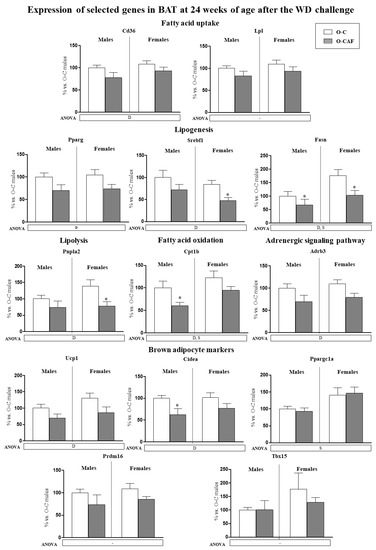 Expression levels in BAT of the genes studied in young animals were also determined in 24-week-old animals, after 8 weeks of WD (Figure 4). At this age, a sexual dimorphism was observed in the expression of some of the genes analysed. Female animals displayed higher mRNA levels of Fasn, Cpt1b and Ppargc1a than males. In addition, O-CAF animals, compared to O-C, presented lower mRNA levels of genes related to lipogenesis (Pparg, Srebf1, and Fasn), lipolysis (Pnpla2), fatty acid uptake (Cd36), and oxidation (Cpt1b), as well as of Adrb3, Ucp1, and Cidea genes than controls.