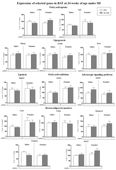 Expression of selected genes related with lipid metabolism (lipogenesis, lipolysis, fatty acid uptake, and fatty acid oxidation) and thermogenesis (adrenergic signalling and brown adipocyte markers) in brown adipose tissue (BAT) of male and female offspring of dams fed a control (O-C) or a cafeteria diet during lactation (O-CAF) at 24 weeks of age and maintained under a standard diet (SD) during the whole period. Animals were killed under ad libitum feeding conditions. mRNA levels were measured by real-time PCR and expressed as a percentage of the value of O-C males. The full names of the genes are indicated in the Materials and Methods section. Data are expressed as the mean ± standard error of the mean of 8 animals per group. Statistics: S, effect of sex; (p < 0.05, two-way ANOVA).