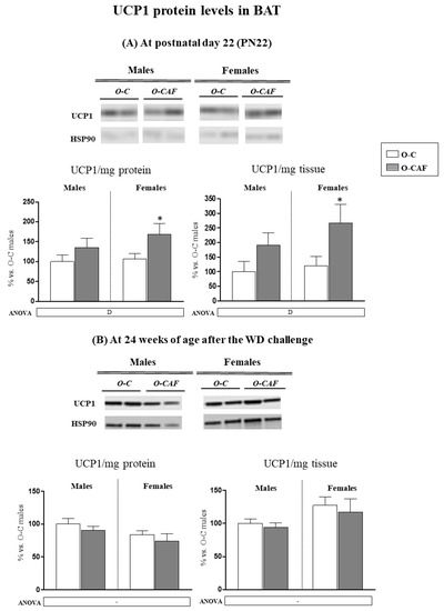 Protein levels of UCP1 were also determined in BAT at PN22 and in adulthood, at 24 weeks of age after 8 weeks of exposure to WD. At PN22, O-CAF animals showed greater levels of UCP1, both when expressed per mg tissue protein (specific UCP1) and per mg tissue, compared with O-C (Figure 6A). No differences were observed in adulthood (Figure 6B).