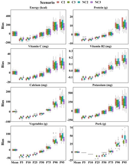Boxplot of biases of intake calculated for energy, protein, vitamin C, vitamin B2, calcium, potassium, vegetables, and pork based on each scenario with WPM method. C2 = Two consecutive 24 h recalls; C3 = Three consecutive 24 h recalls; NC2 = Two non-consecutive 24 h recalls; NC3 = Three non-consecutive 24 h recalls.