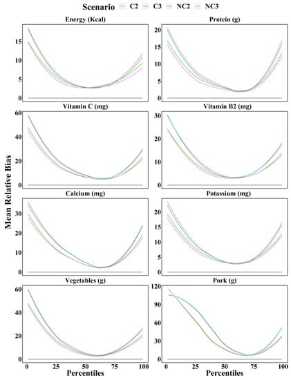 Mean relative bias of the percentiles (from 1st to 99th) of intake calculated for energy, protein, vitamin C, thiamin, calcium, potassium, vegetables, and pork based on each scenario with WPM method. C2 = Two consecutive 24 h recalls; C3 = Three consecutive 24 h recalls; NC2 = Two non-consecutive 24 h recalls; NC3 = Three non-consecutive 24 h recalls.