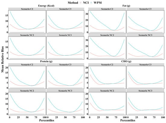 More results are presented in the supplementary material (Table S1, Figures S1–S3), including: the boxplot of bias for each scenario and each dietary component with the WPM method; the smooth line of mean relative bias of the percentiles (from 1st to 99th) for all dietary components based on each scenario with the WPM method; the mean bias, mean relative bias, and MSE of estimates in the 5th, 10th, 25th, 50th, 75th, 90th, and 95th percentiles as well as the mean for each scenario and dietary components with the WPM method; as well as the smooth line of mean relative bias of the percentiles (from 1st to 99th) for all dietary components based on each scenario with the NCI and WPM methods.