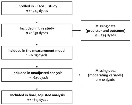 Flow diagram showcasing sample sizes for analysis stages. Listwise deletion was used to take care of missing data.