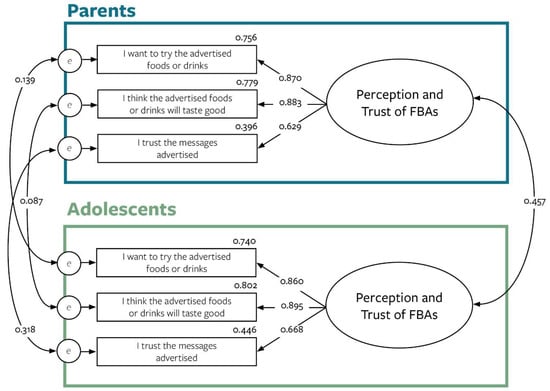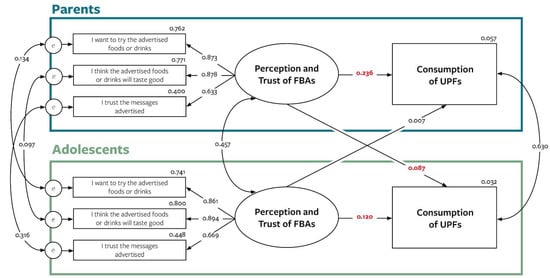 The outcome of consumption of UPFs was set as the endogenous variable in the structural equation model, while the predictor of perception and trust of FBAs remained as a latent variable for both parents and adolescents (Figure 3). The assessment of model fit indicated the model was satisfactory.