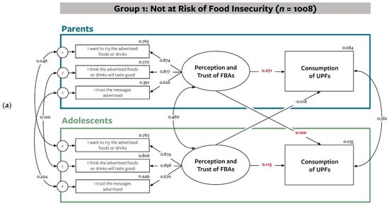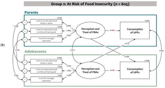 Actor and partner effects of perception and trust of FBAs and consumption of UPFs in parent-adolescent dyads accounting for food insecurity. Significant regression coefficients are bolded in red. Both models adjusted for parents’ sex and parents’ education level. (a) SEM model results for dyads not at risk of food insecurity; (b) SEM model results for dyads at risk of food insecurity. Model fit: Δχ2 = 59.794 & 45.814, df = 26, p = 0.001; RMSEA = 0.037 (90% CI = 0.027 to 0.047), p = 0.98; CFI = 0.990; SRMR = 0.036; AIC = 44485.329.
