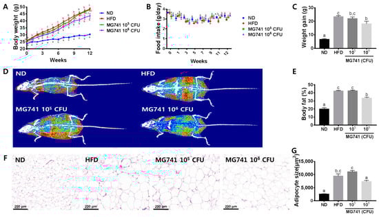 Over the course of 12 weeks, the body weight and body fat percentages of HFD-fed mice were significantly increased without a change in food intake (Figure 1A–E). Moreover, adipocyte size in the HFD group also significantly increased compared with that in the ND group (Figure 1F). The 105 CFU MG741 group did not exhibit significantly reduced weight gain, body fat percentage, or adipocyte size; however, the 106 CFU MG741-administered group showed significantly lower values of these parameters compared with those in the HFD group.