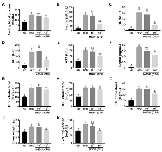 Bifidobacterium animalis ssp. lactis MG741 (MG741) ameliorates high-fat-diet-induced metabolic disorder parameters. (A) Fasting blood glucose; (B) insulin; (C) HOMA-IR; (D) serum ALT; (E) serum AST; (F) serum leptin; (G) serum total cholesterol; (H) serum HDL-cholesterol; (I) serum LDL-cholesterol; (J) liver weight; and (K) liver triglycerides. Data are presented as the mean ± standard error of the mean (n = 9). The different letters (a–c) indicate significant differences (p < 0.05) determined by one-way ANOVA with Tukey’s post hoc tests.