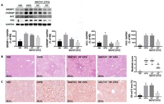 Bifidobacterium animalis ssp. lactis MG741 (MG741) ameliorates high-fat-diet-induced changes in lipid metabolism in the liver. (A) Representative Western blots of SREBP-1, ChREBP, ACC, and FAS. (B) Representative histological results based on H&E staining and steatosis score. (C) Representative histological results based on Oil Red O staining and the positive staining area. Data are presented as the mean ± standard error of the mean (n = 6). The different letters (a–c) indicate significant differences (p < 0.05) determined by one-way ANOVA with Tukey’s post hoc tests.