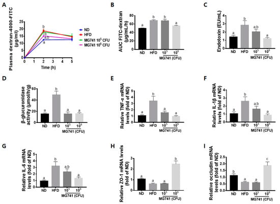 Bifidobacterium animalis ssp. lactis MG741 (MG741) improves high-fat-diet-induced changes in gut barrier function. (A) Plasma FITC-dextran concentration during the gut permeability test; (B) area under the curve of the plasma FITC-dextran levels; (C) plasma endotoxin; (D) β-glucuronidase activity; (E) relative mRNA expression of TNF-α; (F) relative mRNA expression of IL-1β; (G) relative mRNA expression of IL-6; (H) relative mRNA expression of ZO-1; and (I) relative mRNA expression of occludin. Data are presented as the mean ± standard error of the mean (n = 9). The different letters (a–c) indicate significant differences (p < 0.05) determined by one-way ANOVA with Tukey’s post hoc tests.