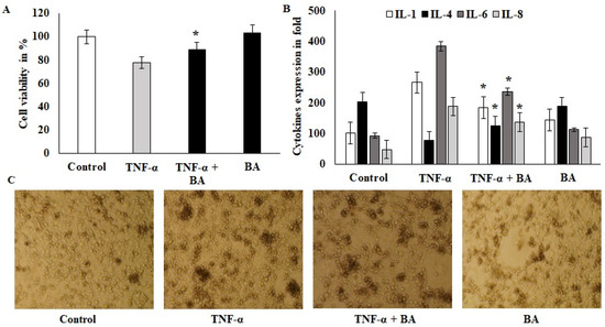 A viability exclusion test was used to assess the cytotoxic effects of BA on HT-29 cell lines. Confluence cells were challenged with 10 ng/mL of TNF-α for 1 h, after which the co-culture with BA showed protective effects and the cell viability was significantly improved compared to the TNF-α alone treated group (Figure 1A). BA alone treated cells did not show toxicity and indicated that no toxic components or endotoxins existed in BA. The immunomodulatory effect of BA was tested on this same model with an increased incubation period and showed downregulated pro-inflammatory cytokines such as IL-1 and IL-6. The values of IL-1 and IL-6 were 273 pg/mL (TNF-α-induced) to 197 pg/mL (BA–treated) and 382 to 211 pg/mL, respectively. The anti-inflammatory marker IL-4 was upregulated by BA treatment compared to TNF-α-induced cells (Figure 1B). Interestingly, IL8, a powerful neutrophil chemoattractant, was increased in TNF-α-induced cells, whereas BA treatment reduced the IL8 expression from 201 to 98 pg/mL concentration (Figure 1B). Inflamed HT-29- and BA-treated cells were observed at 200× objective view under a phase contrast inverted microscope (Figure 1C). The granulation and cellular degradation were observed in TNF-α induction and they were significantly reduced in BA-treated cells. The cell sphere formation and clumping indicate the inflamed morphology and it was reduced in BA-treated cells. These in vitro results showed that BA improves the cell viability and anti-inflammatory characteristics via cell structural regulations (Figure 1C).