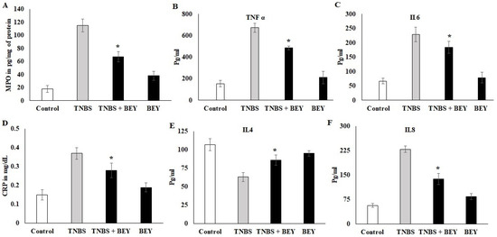 Effect of BEY on inflammatory markers in TNBS-induced colitis mice. The myeloperoxidase-infiltration marker was quantified in TNBS-induced colitis mice and BEY-treated mice after 14 days of the experiment. The values are expressed in pg/mg protein. (A) the neutrophil infiltration marker MPO was quantified; (B,C) TNF-α and IL-6 (pro-inflammatory markers) were quantified in TNBS-induced colitis mice and BEY-treated mice after 14 days of the experiment. The values are expressed in pg/mL. (D) The lymphocytes degradation marker (C-reactive protein) was quantified in TNBS-induced colitis mice and BEY-treated mice after 14 days of the experiment. The values are expressed in mg/dL. (E,F) IL4 and IL8 (anti-inflammatory and macrophage markers, respectively) were quantified in TNBS-induced colitis mice and BEY-treated mice after 14 days of the experiment. The values are expressed in pg/mL. All data were collected from three individual experiments and pooled and expressed as mean ± SD (p < 0.05). * p < 0.05 represents significance compared to the TNBS vs. TNBS + BEY group.