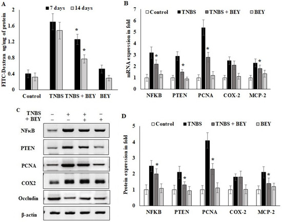 In order to understand the inflammatory marker expression in the histologically affected distal colon compared to a relatively non-affected control colon, real-time PCR was performed to evaluate the expression level of inflammatory markers in the TNBS and BEY-treated colitis mice groups. The mRNA expressions of NFκB, PTEN and PCNA significantly increased in the TNBS-induced mice groups, whereas BEY treatment reduced the significant level of all markers except COX-2 compared to the TNBS-induced group (p > 0.04) (Figure 4B). COX2 expression was comparatively less significant than other tested markers (p > 0.0625). Protein expression also reflects the mRNA expression profile, but COX2 showed insignificant changes between the TNBS induction and BEY-treated groups (Figure 4C,D). Interestingly, the integrity marker occludin was downregulated by TNBS induction and significant recovery of intestinal permeability was reflected in upregulation in the BEY treatment (Figure 4D). In overview of the results, the BEY-induced protective effects on epithelial barrier integrity are mediated by the PTEN/PCNA pathway; highly significant down-regulation was measured, and the PCNA load in colon epithelial tissues was further confirmed using immune histopathological examinations.
