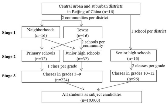 The cross-sectional study was conducted from September 2020 to June 2021 in Beijing, China. The target population was primary and secondary students in grades 3~12 in Beijing; 1st~2nd grade students were not involved due to their cognitive disparity. The study participants were selected using a multi-stage stratified cluster sampling strategy to make the sample representative. Three stages were included during the sampling process of students in grades 3~9: (1) Selection of the sample communities: two communities, including one neighborhood and one town (or two neighborhoods if there was no town), were selected separately in 16 central urban and suburban districts of Beijing in terms of geographical location and economic development level of the communities. (2) Selection of the sample schools: two representative schools, including one primary and one junior high school, were selected separately in the above communities in terms of school conditions. (3) Selection of the sample classes: one class was chosen randomly from each grade (3~9) in the above schools. Because there were no senior high schools located in towns, the selection of 10th~12th grade students consisted of two stages: stage 2 and 3. All students (n = 10,000) in the sample class were invited to the survey, as shown in Figure 1.