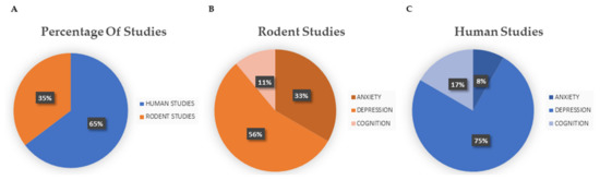 (A) Percentages of human and rodent studies included in this systematic review (six rodent and eleven human studies); (B) percentage of rodent studies divided by main topic (three studies on anxiety and depression, two studies on depression alone, and one study on cognition); (C) percentage of human studies divided by main topic (one study on anxiety and depression, eight studies on depression alone, and two studies on cognition).