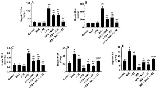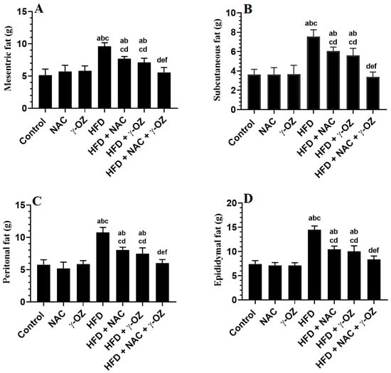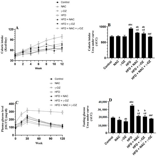 | Parameter | Control | NAC | γ-OZ | HFD | HFD + NAC | HFD + γ-OZ | HFD + NAC + γ-OZ |