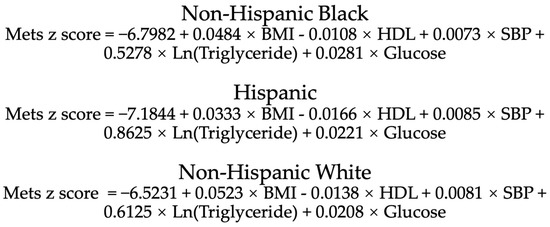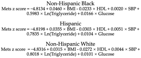 Traditionally, the most widely used diagnostic criteria for MetS, including the National Cholesterol Education Program (NCEP/ATPIII) and International Diabetes Federation definitions, are based on setting cutoff values for each individual measure constituting MetS [13]. However, the traditional definition is still limited in its ability to identify the critical state of MetS (e.g., a fasting glucose level of 6.0 mmol/L when the cutoff is 6.1 mmol/L) and diagnose it in different ethnic groups. The MetS z-score is a widely used score that quantifies the value of MetS latent factor for an individual rather than simply providing a definition [14,15,16]. This score was derived from the NHANES, which includes a nationally representative sample of the US population and indicates the current status of an individual’s MetS in comparison to other people within the US [14]. The value of the MetS z-score represents the number of standard deviations from the mean of the US population. Therefore, with 0 as the cutoff, z-scores exceeding or below this threshold would indicate a greater and lower than average state of MetS, respectively. This approach allows the assessment of the degree of MetS, regardless of its presence or absence. The calculate formulas of MetS BMI z-score for male and female are presented in Figure 1 and Figure 2, respectively.