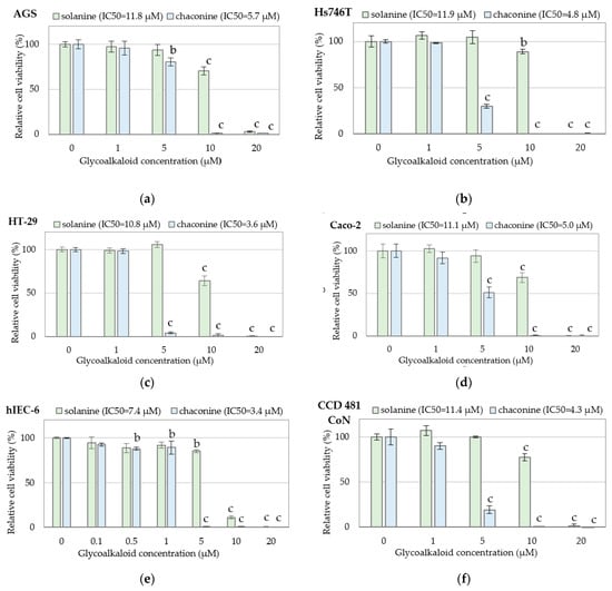 Cytotoxicity of glycoalkaloids against cancer and normal cells: (a) gastric cancer AGS cells; (b) gastric cancer Hs746T cells; (c) colon cancer HT-29 cells; (d) colon cancer Caco-2 cells; (e) normal small intestine hIEC-6 cells; (f) normal colon mucosa CCD 481 CoN cells determined by the MTT test. Changes in cell viability under GA treatment were expressed relative to control cell culture non-treated with GA tested. Values represent the means ± SD (n = 3). ‘b’ p < 0.01, ‘c’ p < 0.001 (Tukey’s post hoc test).