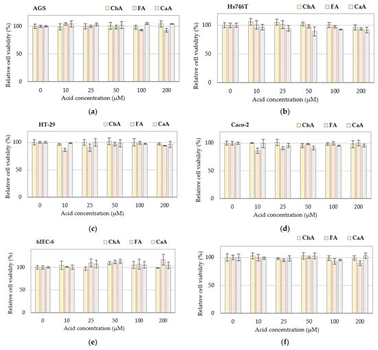 Cytotoxicity of phenolic acids against cancer and normal cells: (a) gastric cancer AGS cells; (b) gastric cancer Hs746T cells; (c) colon cancer HT-29 cells; (d) colon cancer Caco-2 cells; (e) normal small intestine hIEC-6 cells; (f) normal colon mucosa CCD 481 CoN cells determined by the MTT test. Changes in cell viability under acid treatment were expressed relative to control cell culture non-treated with phenolic acid tested. Values represent the means ± SD (n = 3). No statistical significance was detected. CaA–caffeic acid; ChA–chlorogenic acid; FA–ferulic acid.