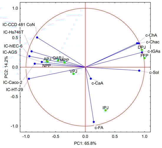 Principal component analysis of the data regarding the content of the bioactive substances in the raw materials and cytotoxicity of the products studied. Explanatory notes: IC-AGS; IC-Hs746T; IC-HT-29; IC-Caco-2; IC- hIEC-6; IC-CoN - IC50 values against AG IC-AGS; IC-Hs746T; IC-HT-29; IC-Caco-2; IC- hIEC-6; and CCD 481 CoN cell lines, respectively; c-CaA; c-ChA; c-FA; c-Sol; c-Chac; c-tGAs–contents of the caffeic acid; chlorogenic acid; ferulic acid; solanine; chaconine and total glycoalkaloids, respectively; APJ; QAPJ; VPJ; IPJ; DPJ; FPP; MPP; NPP—abbreviations describing potato juice products according to ‘Abbreviations’ section.