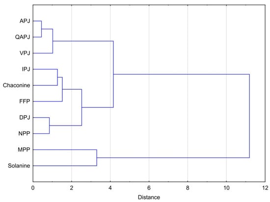 Dendrogram for hierarchical cluster analysis of cytotoxicity of potato juice and the products of its processing attributable to the total glycoalkaloids content. Explanation of the abbreviations used in the table can be found in the section ‘Abbreviations.’
