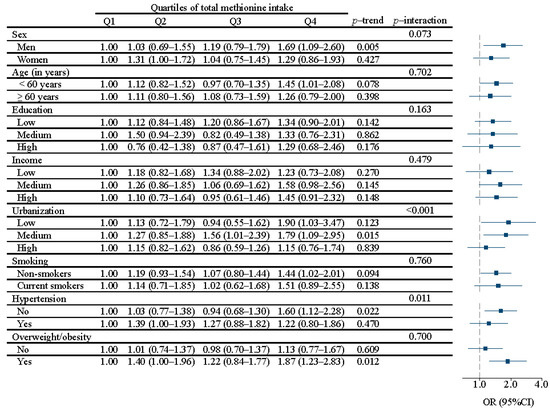 Interestingly, there was a significant interaction between urbanization (p < 0.001) and hypertension status (p = 0.011) in relation to diabetes (Figure 1). Across Q1–Q4, the positive associations were only significant in those who lived in low or medium urbanization areas and those without hypertension. The ORs (95% CI) were 1.00, 1.27(0.85–1.88), 1.56 (1.01–2.39), and 1.79 (1.09 to 2.95) for medium urbanization, and 1.00, 1.03 (0.77–1.38), 0.94 (0.68–1.30), and 1.60 (1.12–2.28) for those without hypertension, respectively. No interaction was identified when stratified by animal or plant methionine (Table 3 and Table 4).