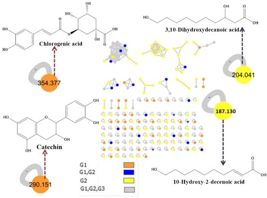 Identified bioactive compounds from P and RJ using LQT-MS-MS analysis and assisted Global Natural Product Social (GNPS) molecular network. The nodes refer to parent masses of the extracts metabolites. The circular nodes refer to the whole parent masses. The triangle nodes represent parent ions that have been identified in the GNPS molecular network. G1: Propolis, G2: Royal jelly, G3: blank solvent used.