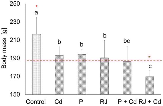 Final body mass [g] of females after exposure to Cd, P, RJ, and a combination of P or RJ with Cd (P + Cd or RJ + P). The same letters denote homogenous groups. The asterisks above bars indicate significant differences between the initial (red line) and final (bar) body mass in each group (ANOVA, HSD Tukey test, p < 0.05). The average initial body mass was 183.27 ± 13.36. Cd—cadmium group where rats were receiving Cd as CdCl2 (4.5 mg/kg/day) during the experiment, P—propolis group where animals were treated with propolis (50 mg/kg/day), RJ—royal jelly group where animals were treated with royal jelly (200 mg/kg/day), P + Cd—combined treatment group where animals were pretreated with propolis for one week and then treated simultaneously with propolis and cadmium, RJ + Cd—combined treatment group where animals were pretreated with royal jelly for one week and then simultaneously treated with royal jelly and cadmium.