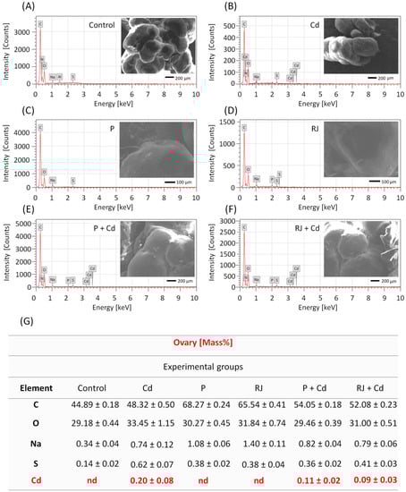 EDX spectra of a selected area of the ovary (SEM of the tissue inserted in the graphs) in the different treated groups: control (A), Cd (B), P (C), RJ (D), P + Cd (E), and RJ + Cd (F), illustrating qualitative elemental composition, and quantitative analysis (G). In Figures (A–E): horizontal scale—X-ray energy; vertical scale—X-ray counts. C—carbon, Na—sodium, O—oxygen, S—sulfur, Cd—cadmium, nd—not detected.